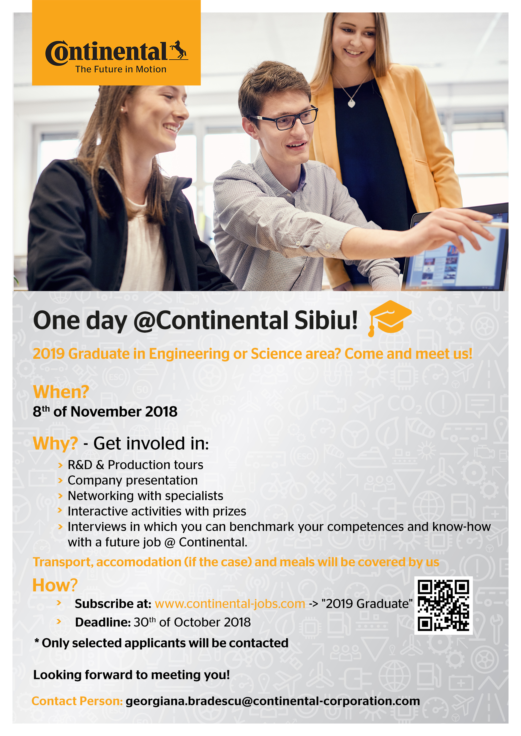 Studentii A.C.E. interesați să participe la o vizită pe platforma companiei Continental de la Sibiu sunt invitați să consulte și să se înscrie pe platforma on-line a companiei (disponibilă via QR code din posterul afișat - aici). Vizita va avea loc în data de 8 noiembrie 2018.