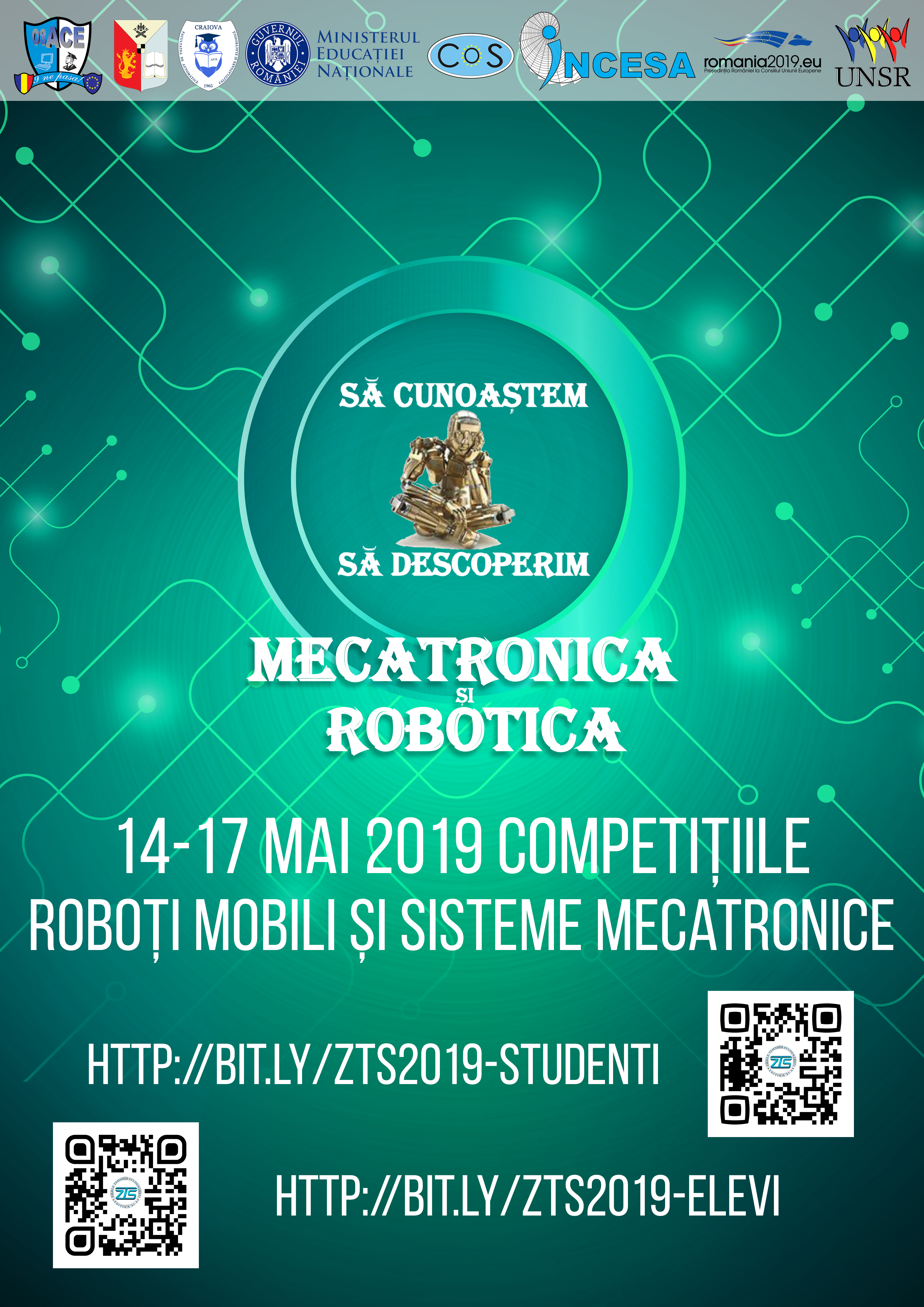 - Două competiții dedicate Roboţilor mobili şi Sistemelor mecatronice (poster). Fiecare centru universitar se va prezenta cu o echipa de studenți/probă și 1-2 echipe de liceeni/probă; Totodata în cadrul acestor competiții vom avea și echipe de elevi care vor participa la o competiție similară destinată mediului preuniversitar.
