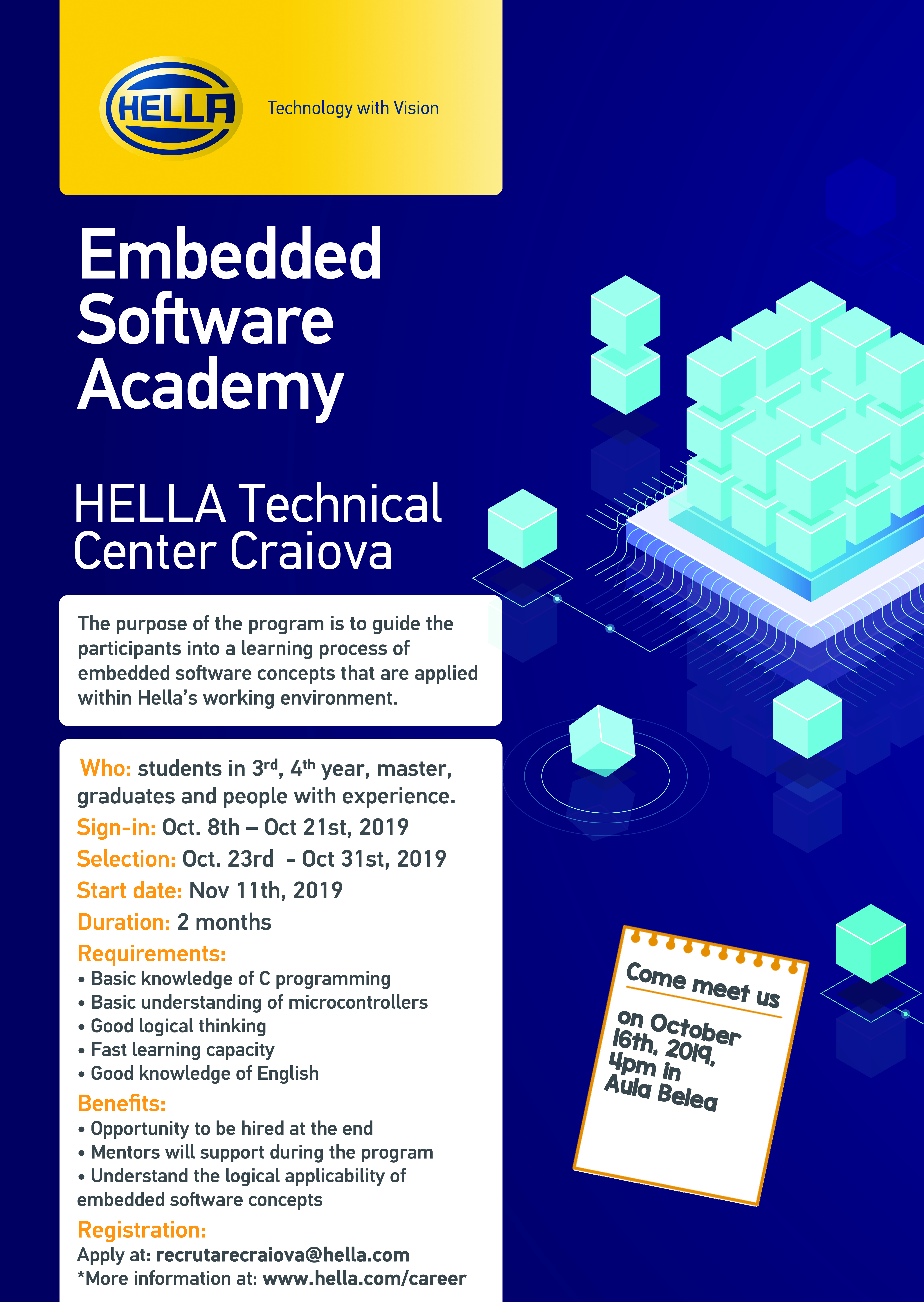 Compania Hella din Craiova invită studenții interesați să se înscrie la Hella Embedded Software Academy 2019 - detalii.
