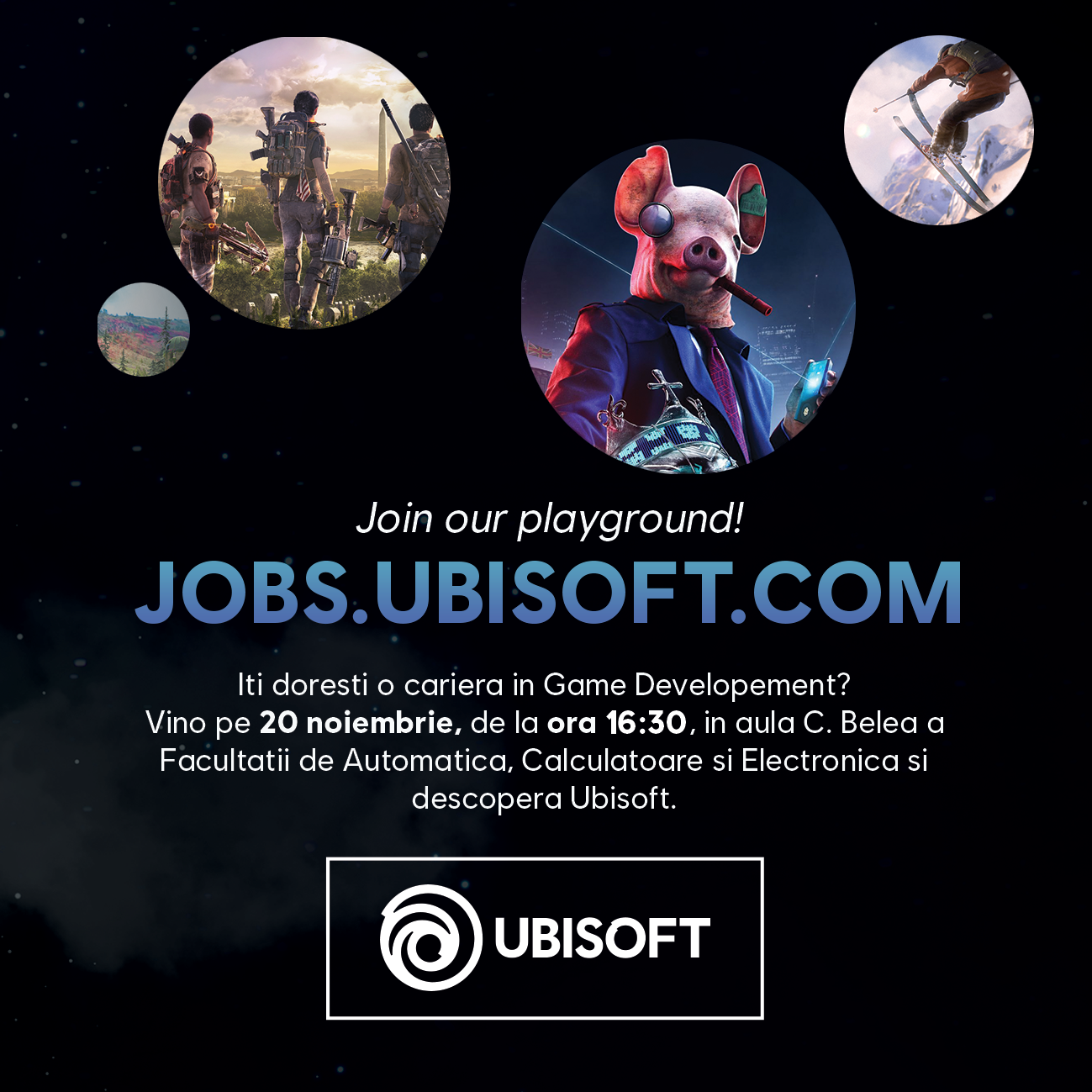 Studenții și cadrele didactice ai Facultății de Automatică, Calculatoare și Electronică sunt invitați să participe la întalnirea cu studioul Ubisoft din Craiova, miercuri 20.11.2019, în Aula Constantin BELEA, între orele 16:30 - 18:00. Vor fi prezentate programele de formare ale companiei adresate comunității studențești, ofertele de stagii de practică/internship, precum și oportunitățile de angajare. Posterul întâlnirii este disponibil aici.