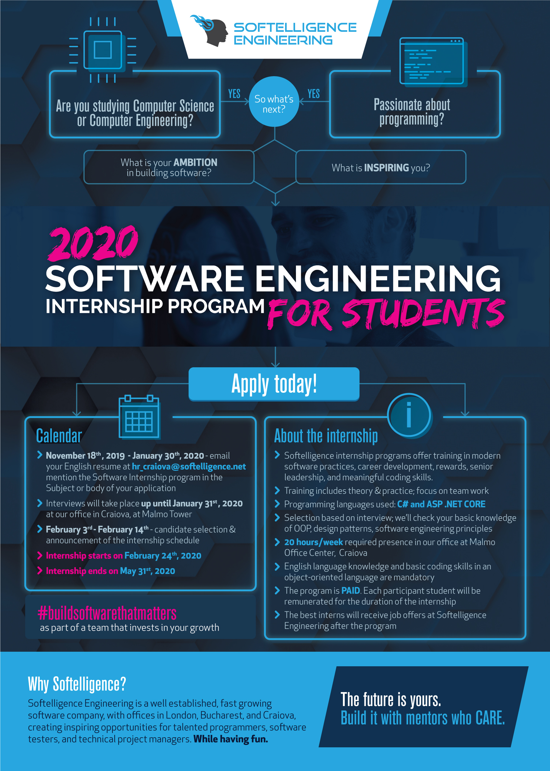 The internship will take place at the Softelligence Engineering office at Malmo Office Tower in Craiova. The program is paid.