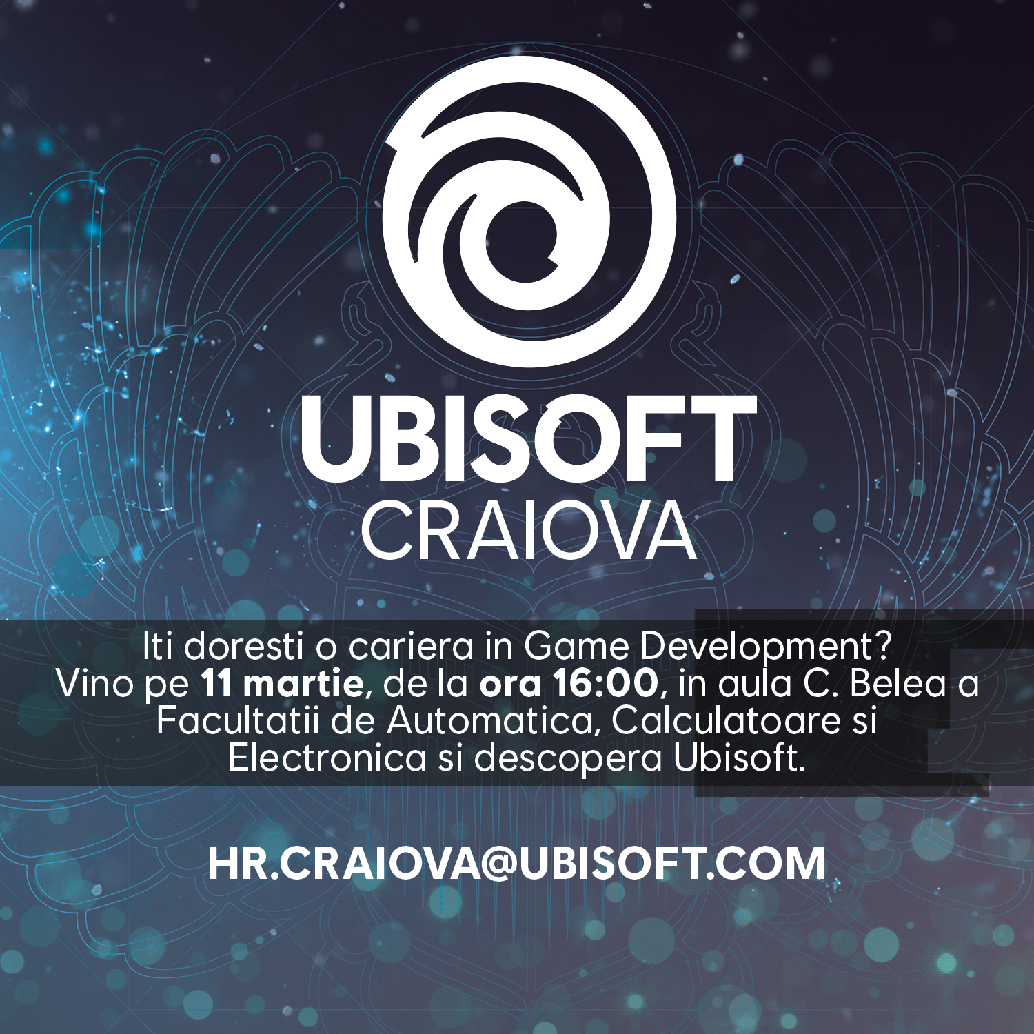 Studenții și cadrele didactice ai Facultății de Automatică, Calculatoare și Electronică sunt invitați să participe la întalnirea cu compania Ubisoft - studioul din Craiova, miercuri 11.03.2020, în Aula Constantin BELEA, între orele 16:00 - 18:00. Vor fi prezentate programele de formare ale companiei adresate comunității studențești, ofertele de stagii de practică/internship, precum și oportunitățile de angajare. Posterul întâlnirii este disponibil aici.