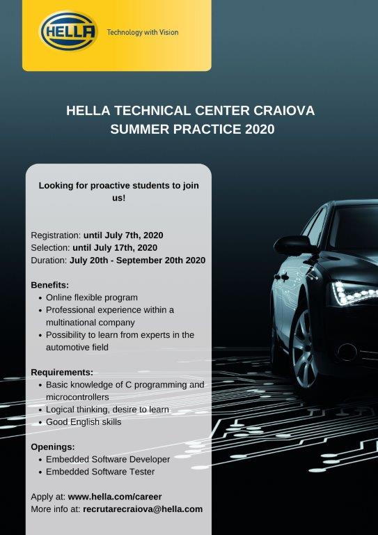 Hella Technical Center Craiova is proud to host the online edition of the Hella Summer Practice, starting on July 20th, 2020. The program is addressed to proactive students, interested in accessing valuable knowledge in the embedded domain. Successful applicants will be guided into a learning process of embedded software concepts that are applied in Hella’s working environment. Applications are welcomed at www.hella.com/career