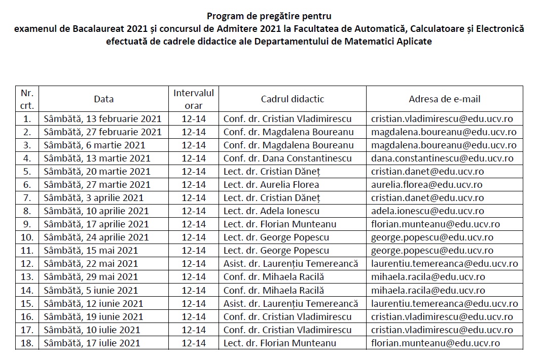 Facultatea de Automatică, Calculatoare și Electronică, în parteneriat cu Departamentul de Matematici Aplicate, oferă sprijin în pregătirea dumneavoastră, a elevilor, organizând activități didactice on-line de pregătire suplimentară la Matematică pentru examenul de Bacalaureat - sesiunea IUNIE 2021 și concursul de Admitere 2021 la Facultatea de Automatică, Calculatoare și Electronică a Universității din Craiova - sesiunea IULIE 2021.