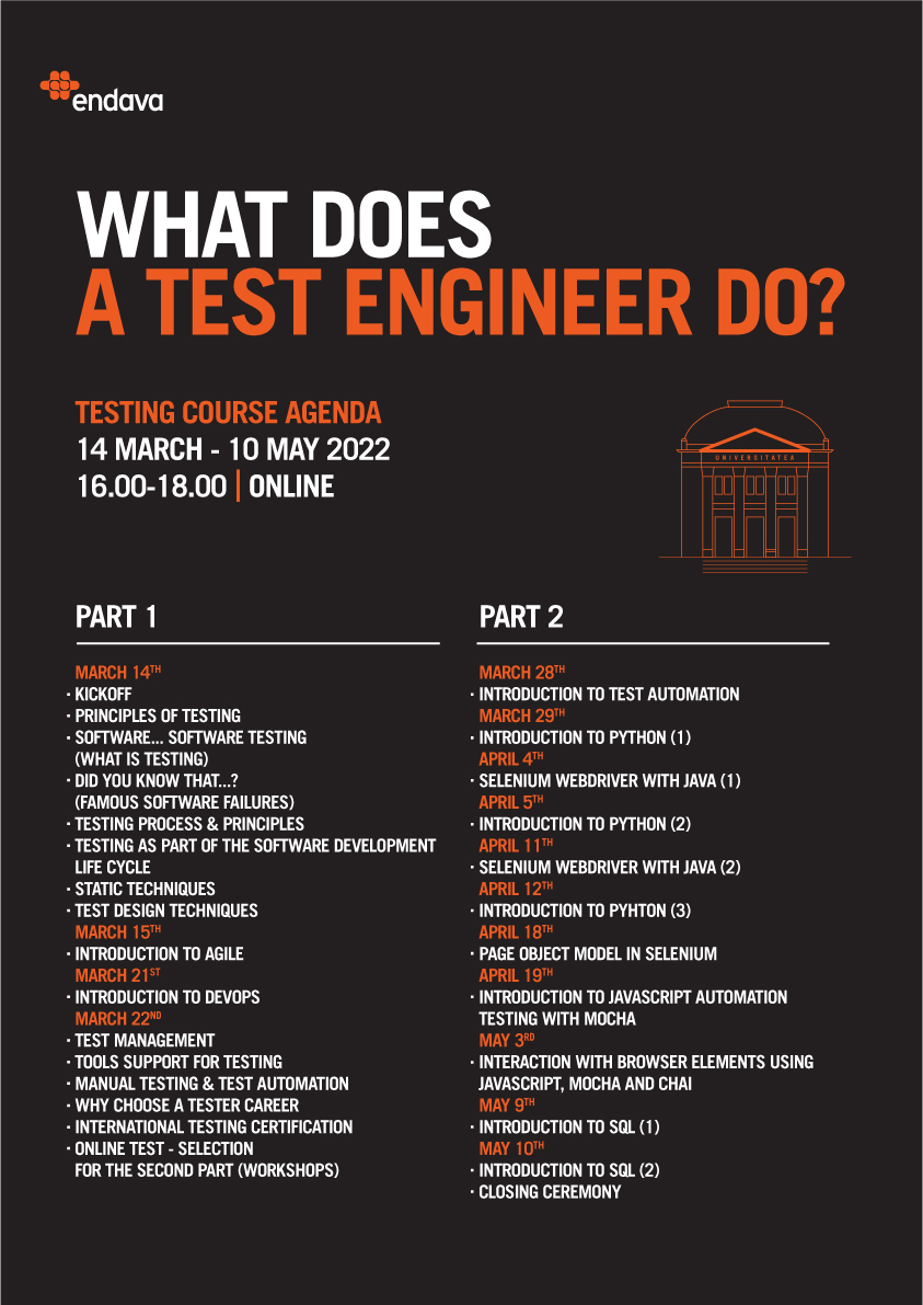 We are inviting you to the What does a Test Engineer do? course, designed by Endava for the students from our University, which will offer you a global understanding about the dynamic world of testing.