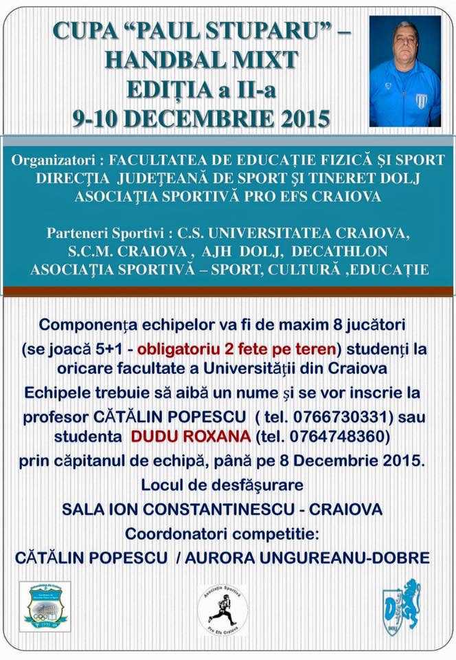Echipa de handbal mixt formata din studenti ai facultatii A.C.E. a ocupat locul al doilea in cadrul competitiei locale Cupa Paul Stuparu editia a II-a, desfasurata in perioada 9 - 10 decembrie 2015. Va oferim cateva imagini informative despre competitie (aici), cupa (aici) si echipa A.C.E. (aici).