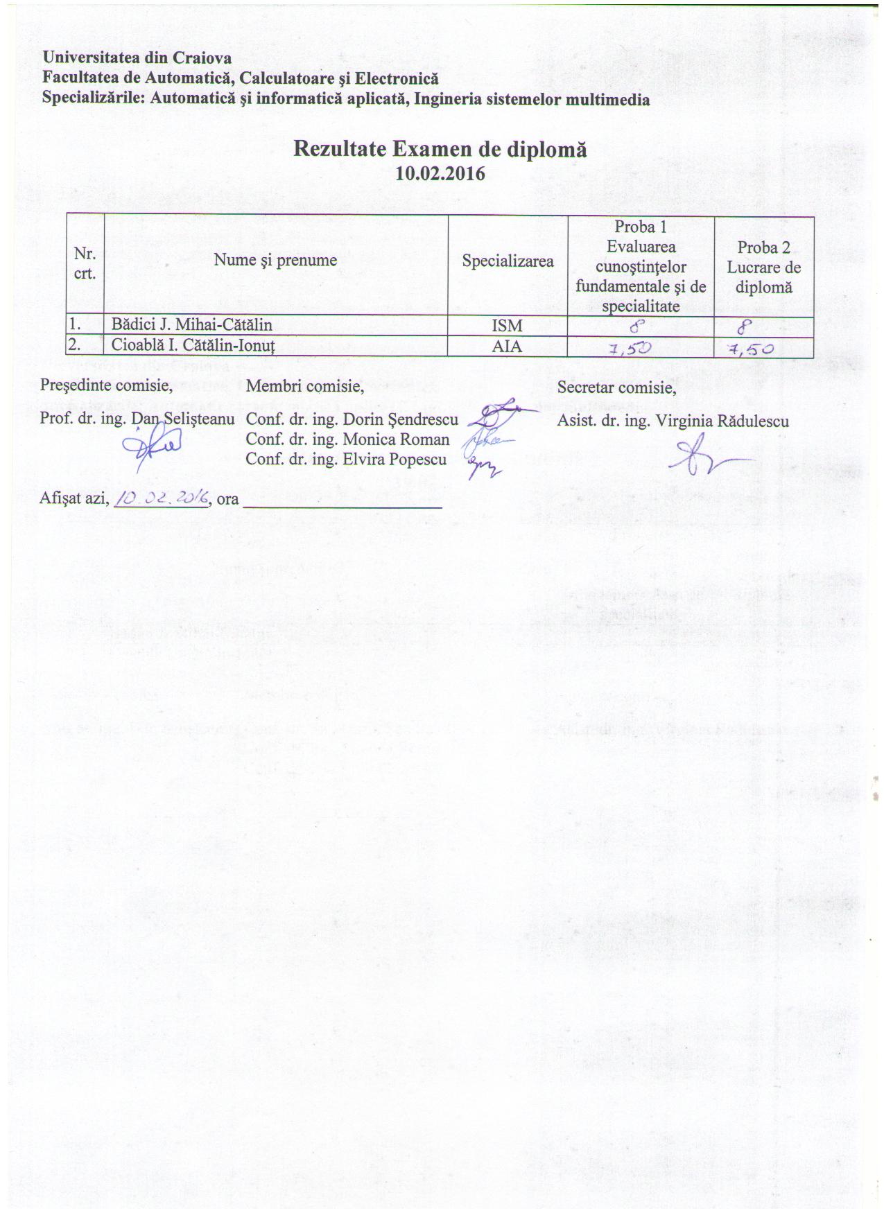 Rezultatele examenelor de finalizare a studiilor - sesiunea FEBRUARIE 2016 - sunt disponibile pe specializari: