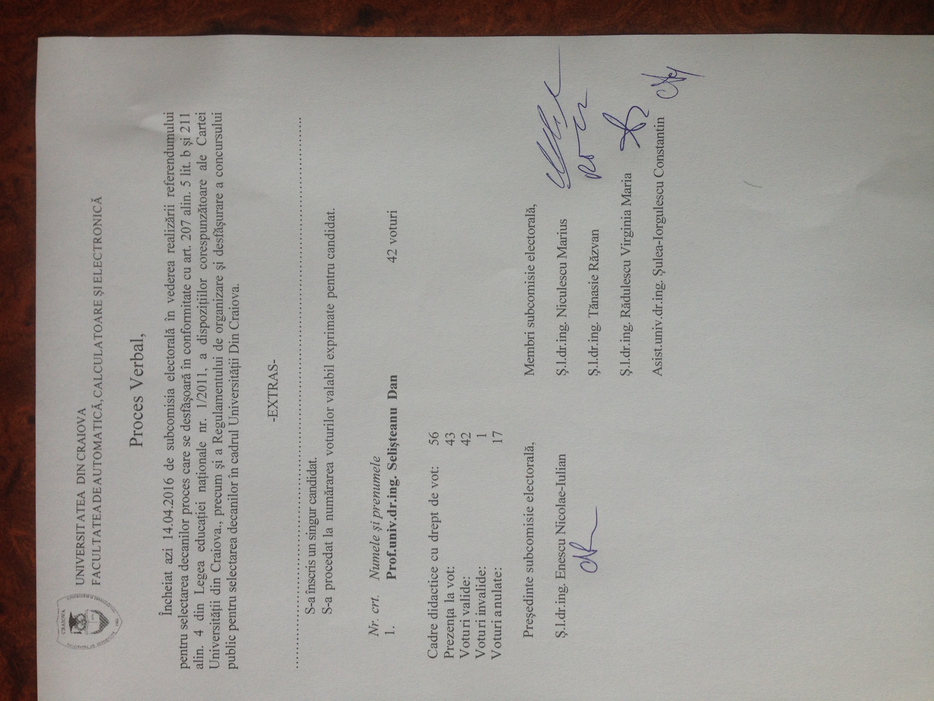 Procesul verbal incheiat cu ocazia votului consultativ exprimat de cadrele didactice ale Facultatii de Automatica, Calculatoare si Electronica poate fi consultat aici.
