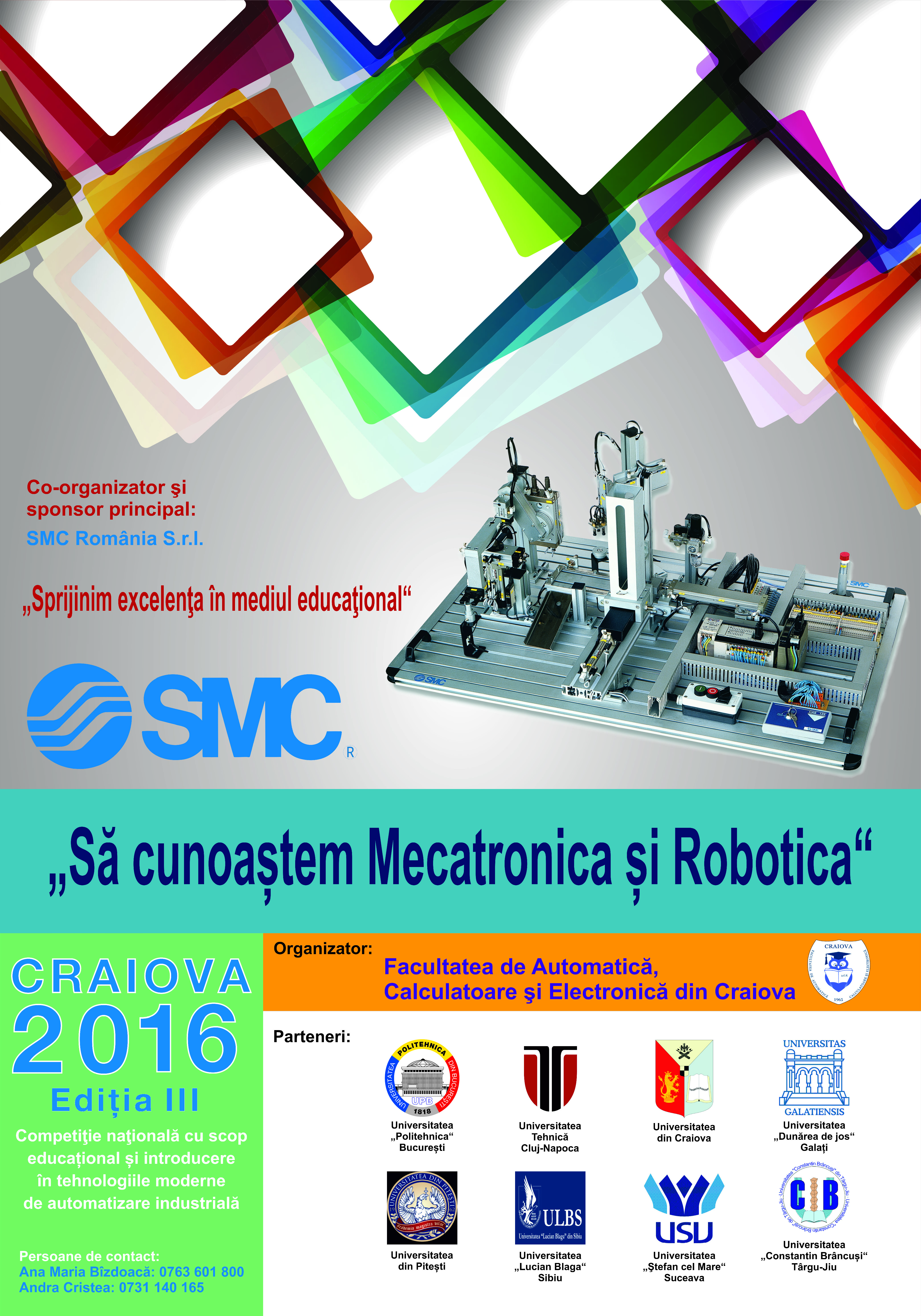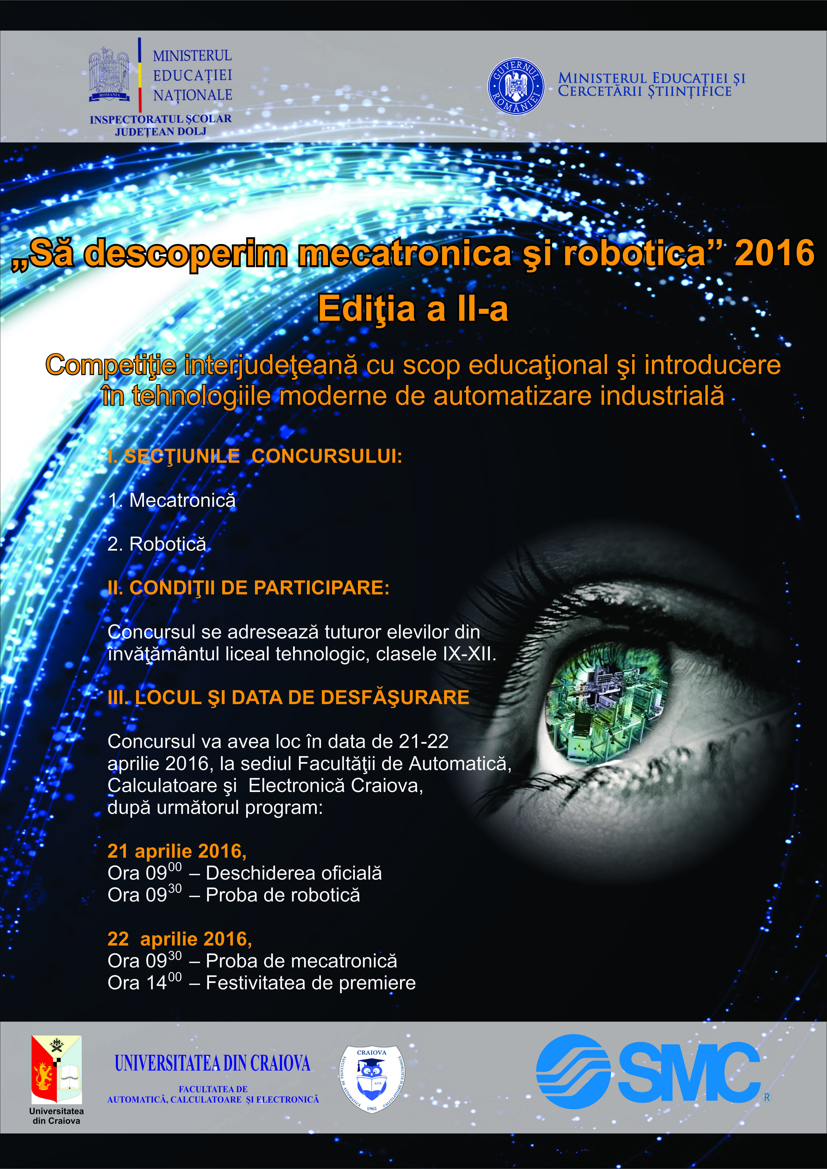 Manifestarile Sa cunoastem mecatronica si robotica 2016 – competitia adresata studentilor, respectiv Sa descoperim mecatronica si robotica 2016 se bucura de participarea tinerilor din Suceava, Galati, Bucuresti, Pitesti, Sibiu, Cluj, Tirgu Jiu si Craiova. Ambele manifestari fac parte din calendarul manifestarilor aprobate de Ministerul Educatiei Nationale si Cercetarii Stiintifice , avand ca unic scop promovarea excelentei in educatie si formare.