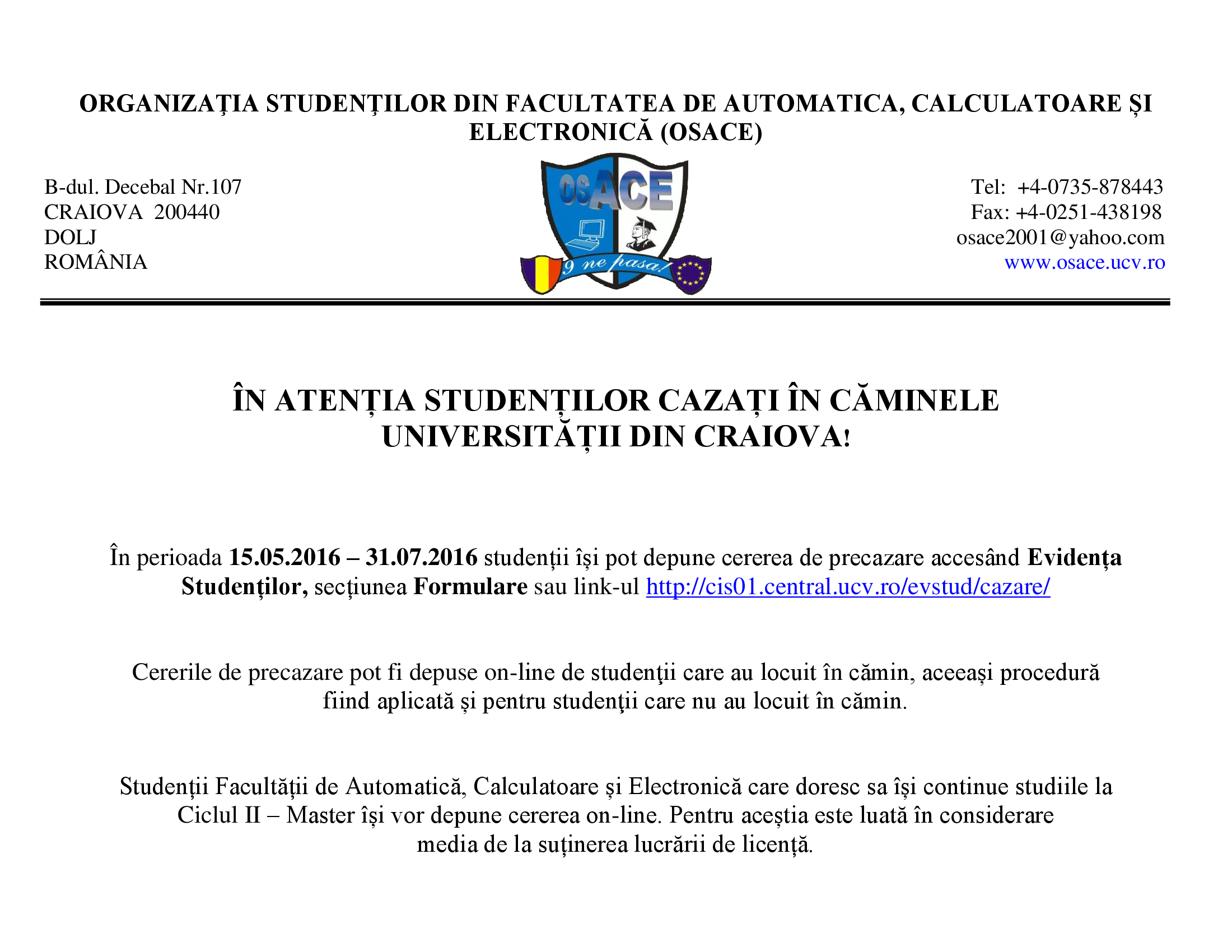 Studentii A.C.E. interesati de cazare in anul universitar 2016-2017 sunt rugati sa consulte urmatorul anunt: aici.