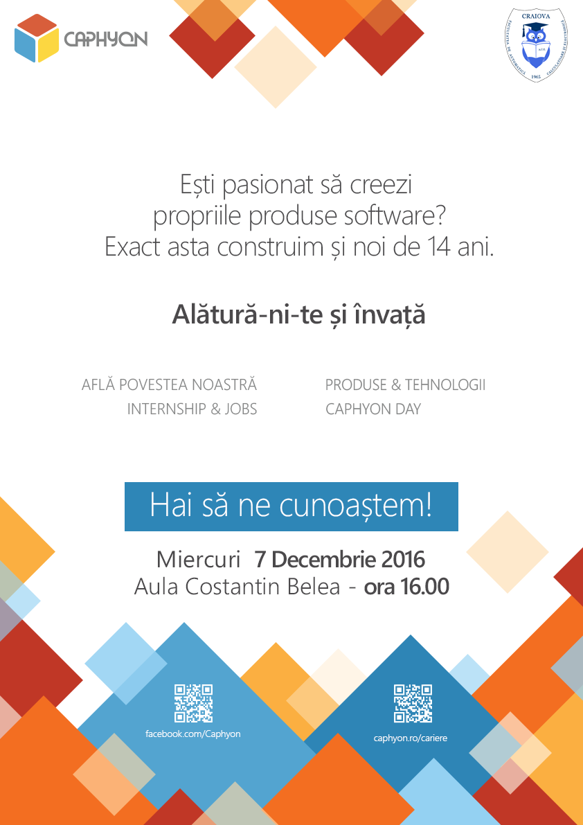Studentii si cadrele didactice ale Facultatii de Automatica, Calculatoare si Electronica sunt invitati sa participe la intalnirea cu compania Caphyon din Craiova, din data de miercuri 07.12.2016, orele 16:00, in Aula Constantin Belea.