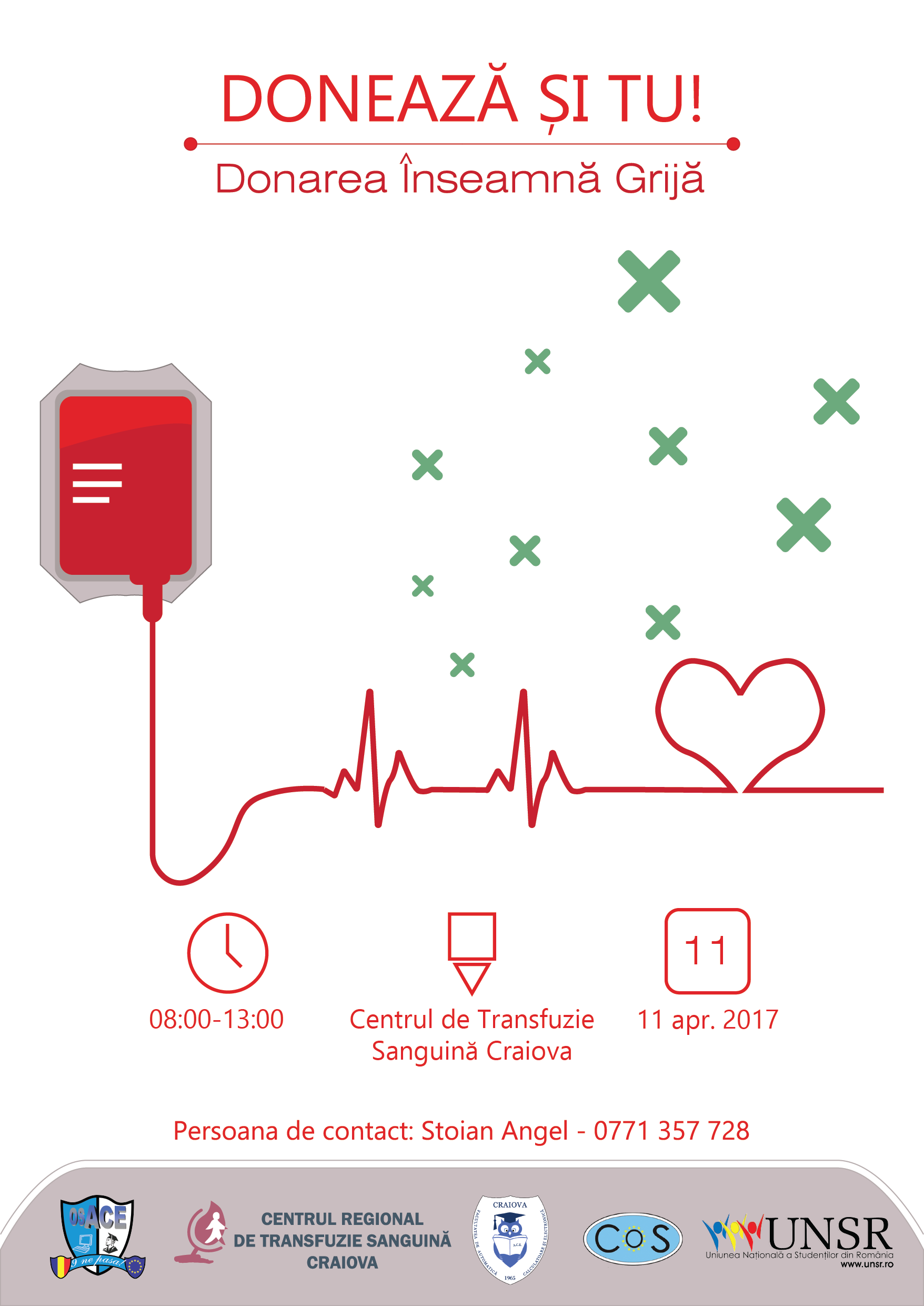 Donează și tu! marți, 11 aprilie la Centrul de Transfuzie Sanguină din Craiova. Voluntarii O.S.A.C.E. (Organizatia Studentilor de la Facultatea de A.C.E.) te vor aștepta începând cu ora 08:00.