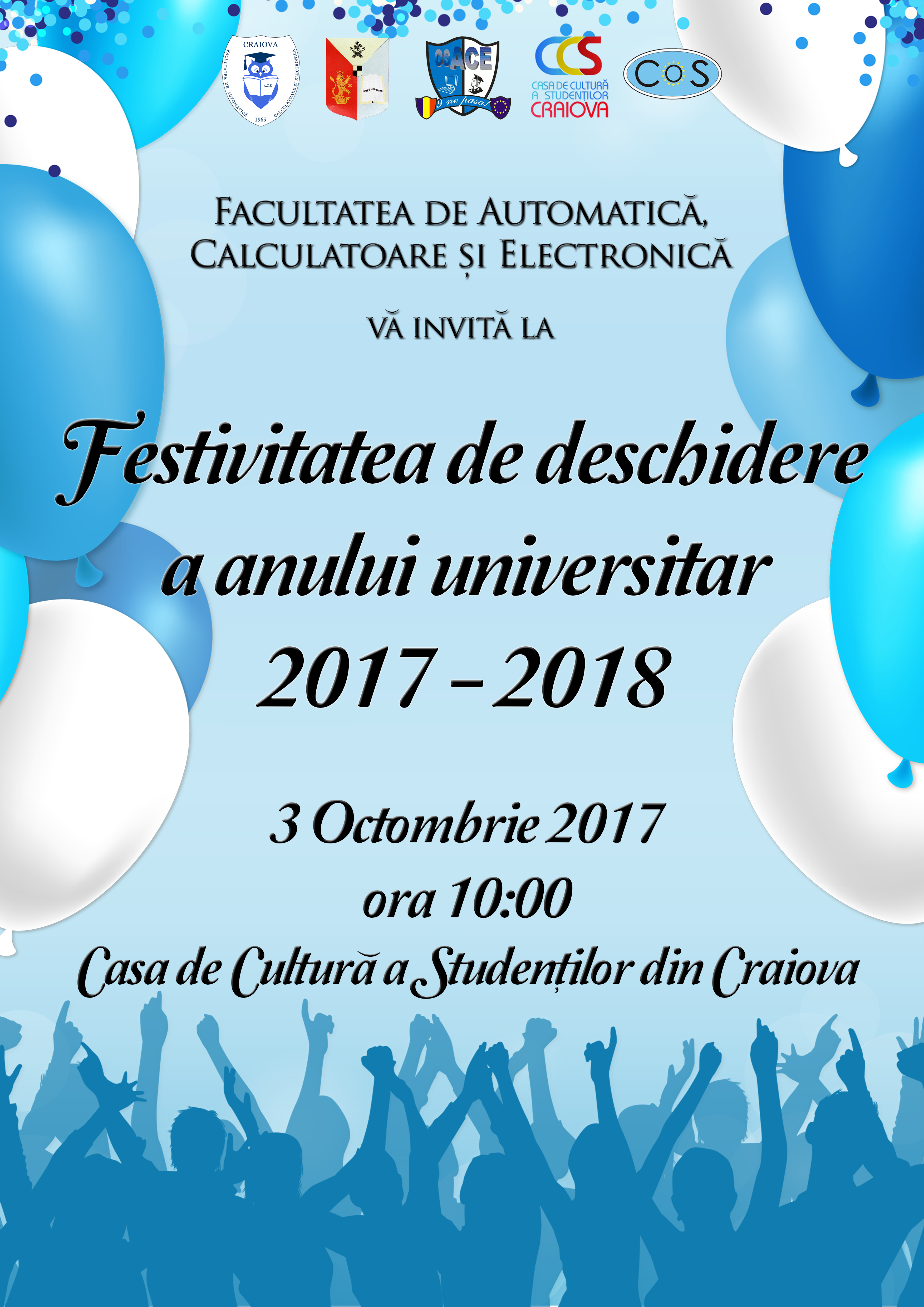 Facultatea de Automatica, Calculatoare si Electronica va invita sa participati la festivitatea de deschidere a anului universitar 2017-2018, care va avea loc la Casa de Cultura a Studentilor din Craiova (strada Eugeniu Carada nr. 10 - web), in data de 3 octombrie 2017, ora 10:00.